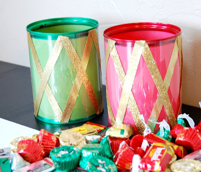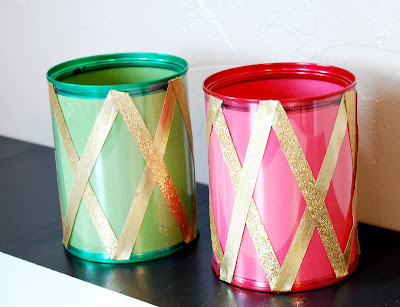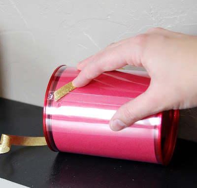 Put a little dot of hot glue on the can and put your ribbon on it. Do this on the top and the bottom of the can to create a zigzag design on the can.