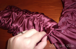 Pull one string from the stitch and make the satin ruffle. Pull to make ruffles even.