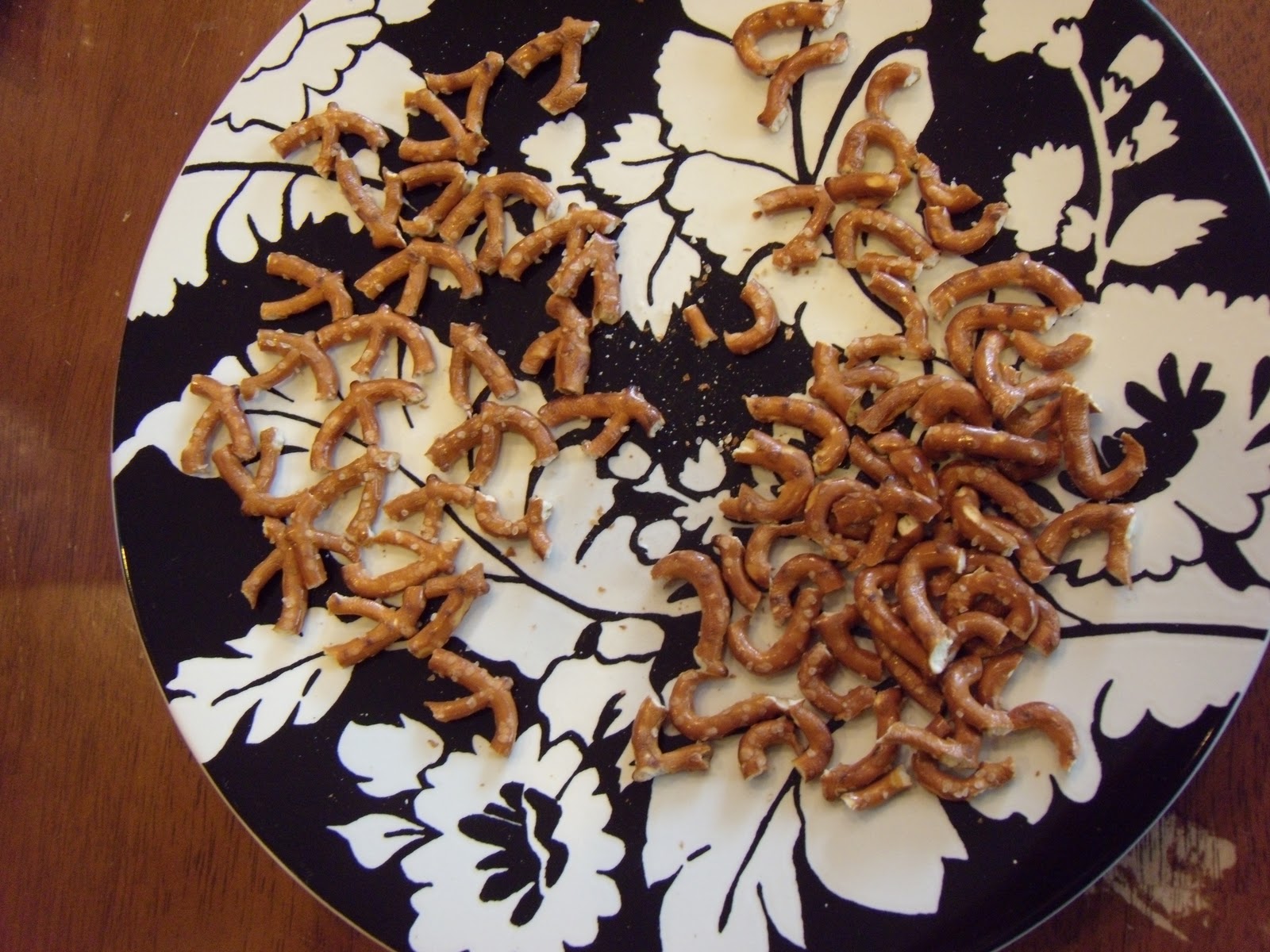 Step 2: While your cupcakes are cooling prepare your pretzels. Snap pretzels in 1/2 then snap the tops off of them. This will make them look like little antlers. Put them on a plate and set them aside.
